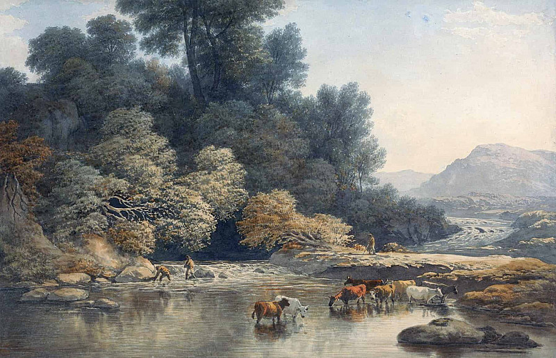 En el primer plano, un grupo de ganado – vacas y bueyes – bebe agua en el río, mientras que dos figuras humanas, presumiblemente pastores, observan la escena desde una distancia prudencial. La presencia del ganado sugiere una actividad humana vinculada a la tierra y al ciclo natural de la vida rural.