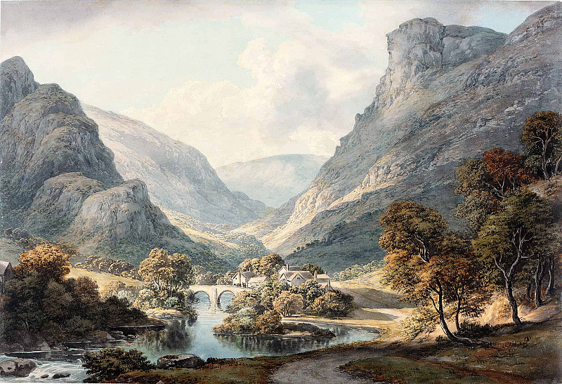 El cielo, ocupando la parte superior de la composición, está poblado de nubes dispersas que suavizan la luz y añaden profundidad a la perspectiva. La atmósfera general es de quietud y paz, evocando una sensación de nostalgia por un mundo rural idealizado. La meticulosa atención al detalle en la representación de los elementos naturales –la textura de las rocas, el reflejo del agua, la variedad del follaje– sugiere una profunda admiración por la belleza del paisaje y una intención de capturar su esencia con fidelidad. La obra transmite un mensaje implícito sobre la importancia de la conexión con la naturaleza y la búsqueda de refugio en entornos tranquilos y contemplativos. Se intuye una valoración de lo sencillo, lo auténtico y lo duradero frente a las agitaciones del mundo moderno.
