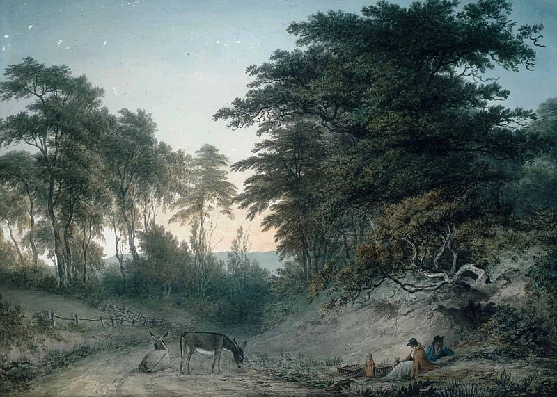 John Glover – A Family And Two Donkeys Resting By A Country Road