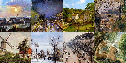 A pesar de ser pobre durante toda su vida, fue conocido por animar a jóvenes artistas postimpresionistas como Gauguin y Van Gogh. Entre los paisajes famosos de Pissarro se encuentran Vista de Louveciennes, 1869 (National Gallery, Londres); Huerta con árboles en flor, primavera, Pontoise (1877, Musée d’Orsay); «Tejados rojos» (1877, Musée d’Orsay); y sus cuadros «Boulevard Montmartre» (1897-8).