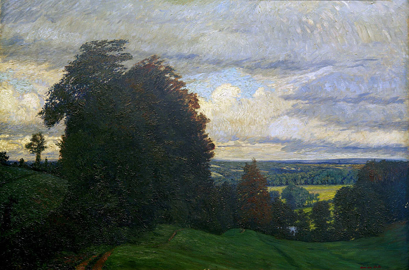 Tal vez sea un cuadro de un gran campo con árboles a lo lejos y un cielo azul con nubes blancas sobre él y un campo verde en primer plano.