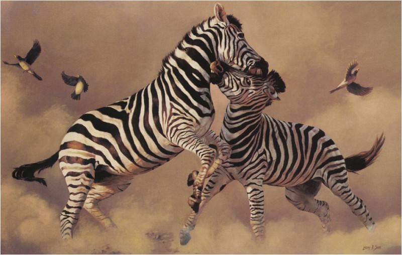 Tal vez sea una pintura de dos pájaros de pie en un campo de hierba con cebras en el fondo.